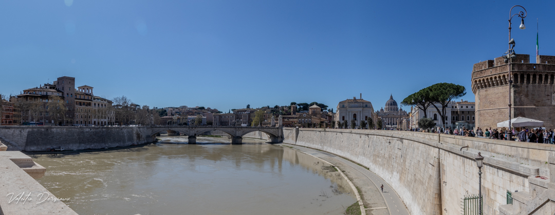 Il était aux alentours de 13h lorsque nous avons traversé le Ponte Sant’Angelo, ce magnifique pont bordé de statues d’anges, imaginé par Le Bernin. En marchant lentement sur ses pavés, nous avons savouré la vue sur la basilique Saint-Pierre, majestueuse à l’horizon, et le calme du Tibre qui coulait paisiblement sous nos pas.