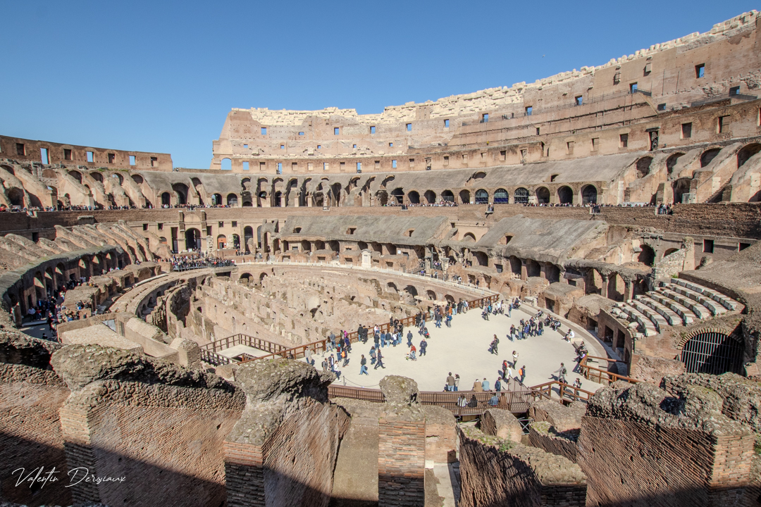 La visite commençait par les arches extérieures de l’arène. En avançant dans ce dédale de pierre, on sentait déjà toute la puissance de ce lieu chargé d’histoire. Nous avons ensuite gravi un escalier menant à l’étage supérieur, où se tenait une exposition dédiée au Colisée : objets anciens, maquettes, documents illustrés… Une belle immersion dans le passé de l’amphithéâtre.